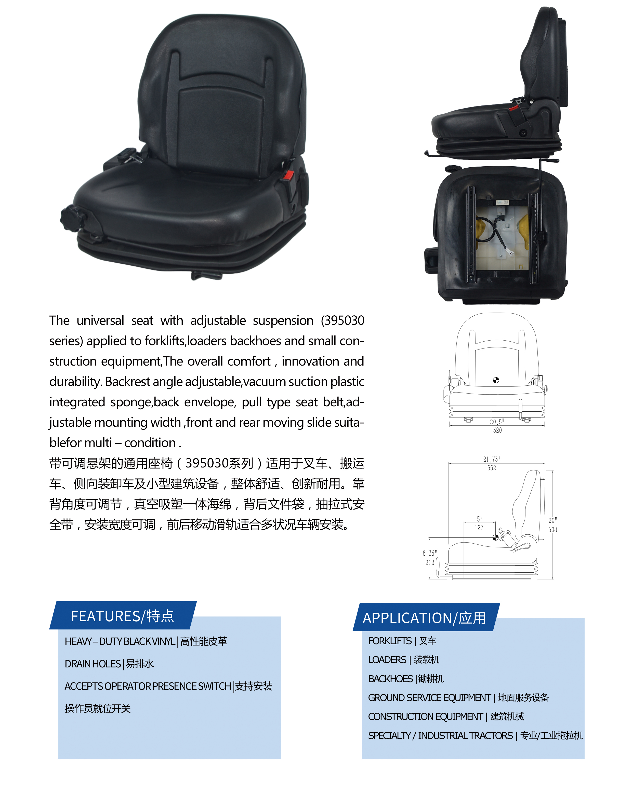 带可调悬架的通用座椅( 395030系列)适用于叉车、搬运:车、侧向装卸车及小型建筑设备,整体舒适、创新耐用。靠背角度可调节,真空吸塑-体海绵,背后文件袋,抽拉式安:全带,安装宽度可调,前后移动滑轨适合多状况车辆安装。