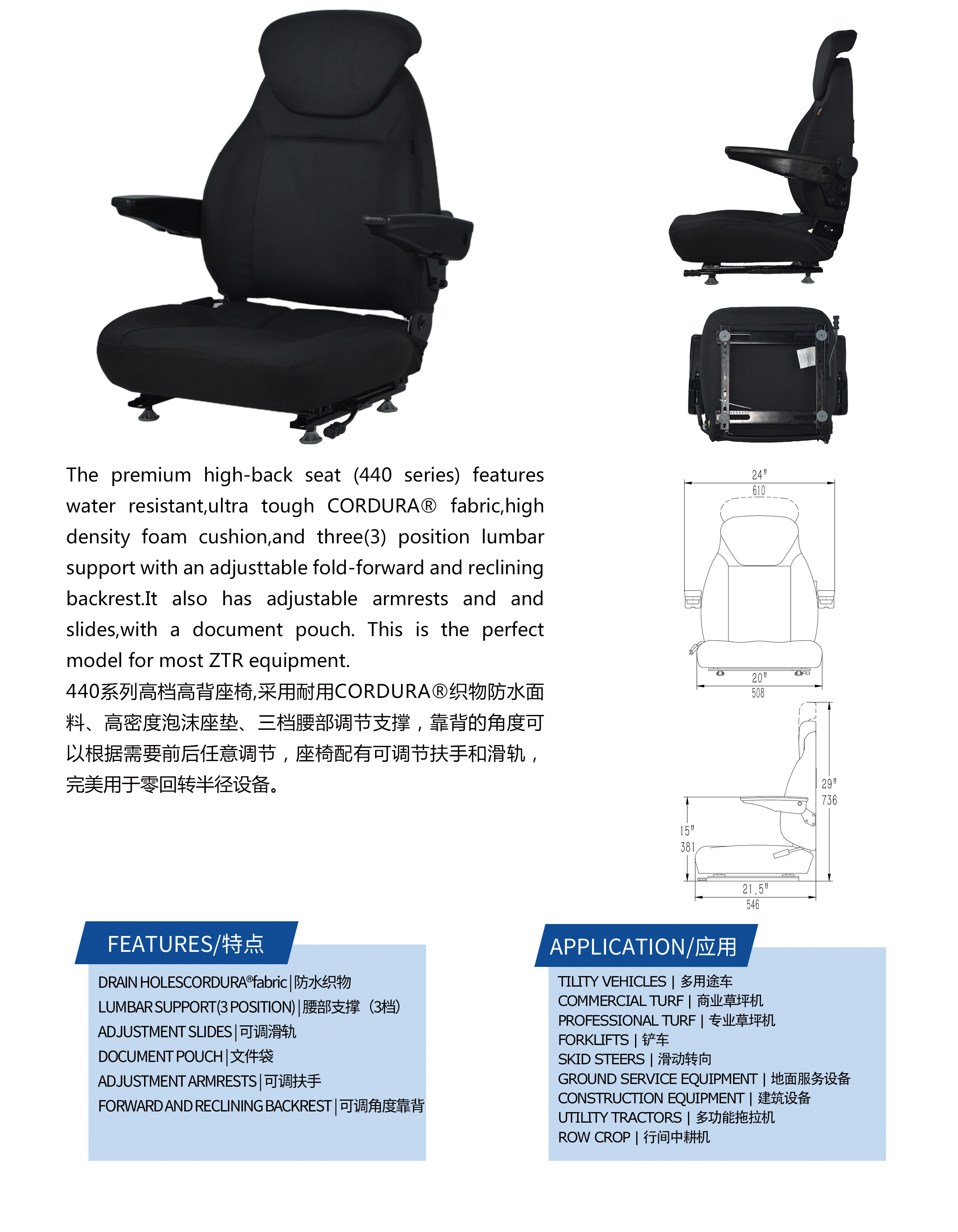 440系列高档高背座椅,采用耐用CORDURA⑧织物防水面料、高密度泡沫座垫、三档腰部调节支撑,靠背的角度可以根据需要前后任意调节,座椅配有可调节扶手和滑轨,完美用于零回转半径设备。