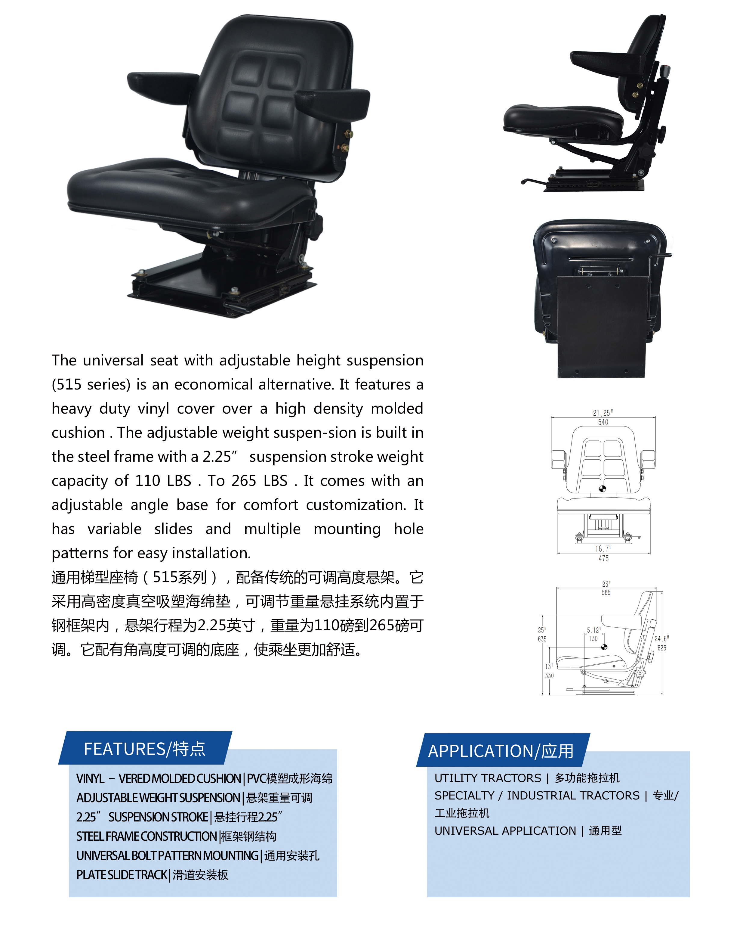 通用梯型座椅( 515000系列) ,配备传统的可调高度悬架。它采用高密度真空吸塑海绵垫,可调节重量悬挂系统内置于钢框架内,悬架行程为2.25英寸,重量为110磅到265磅可调。它配有角高度可调的底座,使乘坐更加舒适。
