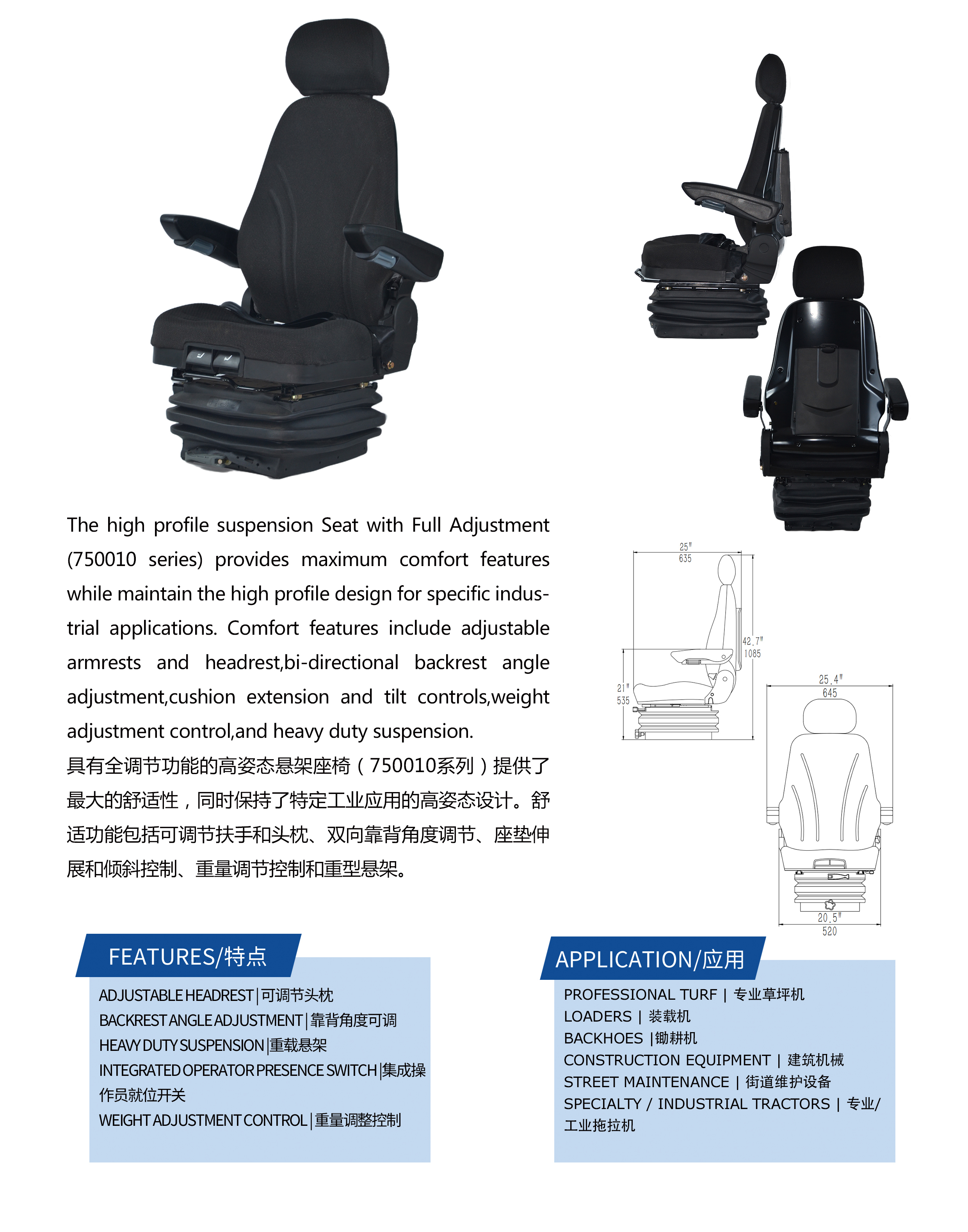 具有全调节功能的高姿态悬架座椅( 750010系列)提供了最大的舒适性,同时保持了特定I业应用的高姿态设计。舒适功能包括可调节扶手和头枕、双向靠背角度调节、座趋伸展和倾斜控制、重量调节控制和重型悬架。