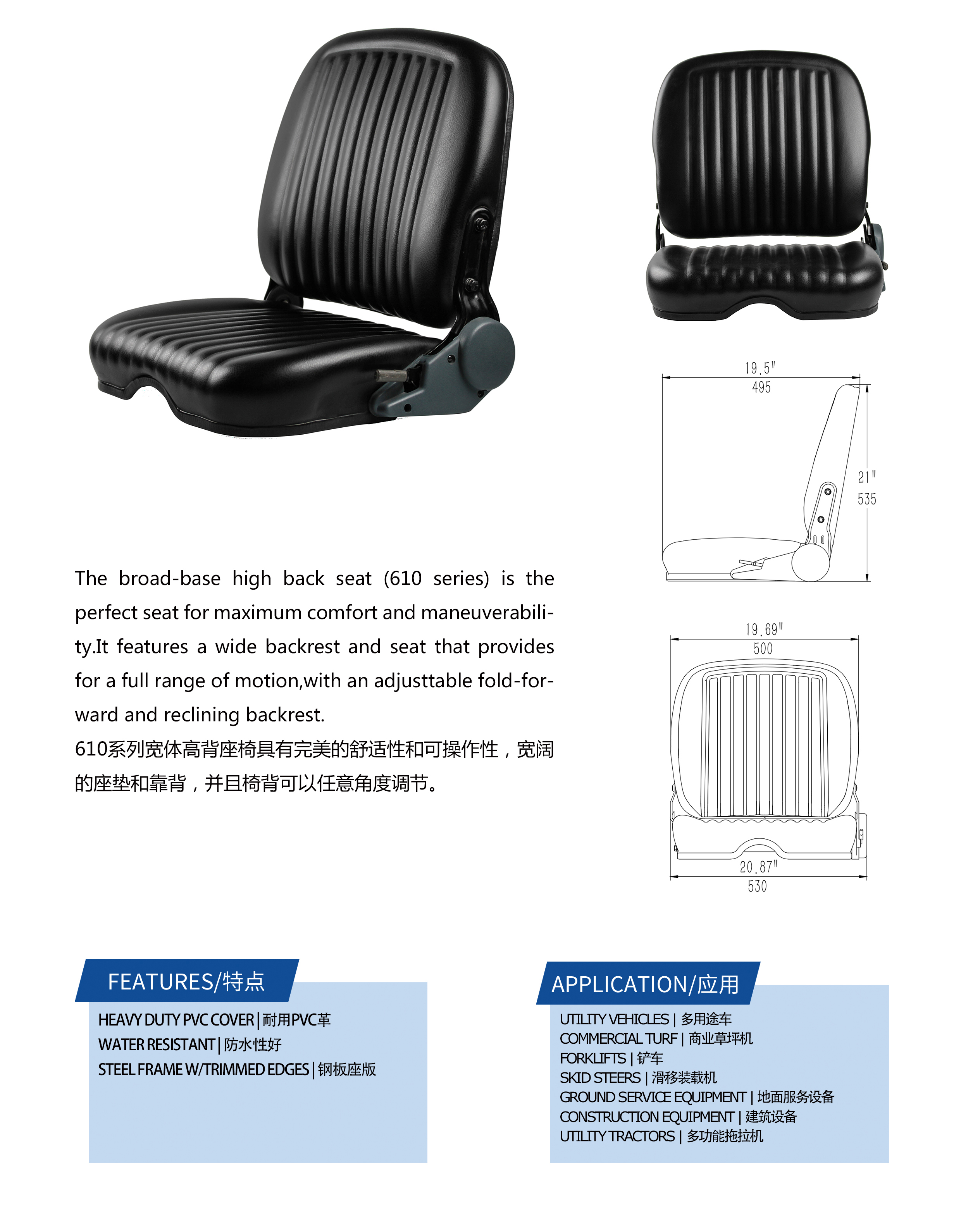 610系列宽体高背座椅具有完美的舒适性和可操作性,宽阔的座垫和靠背,并且椅背可以任意角度调节。